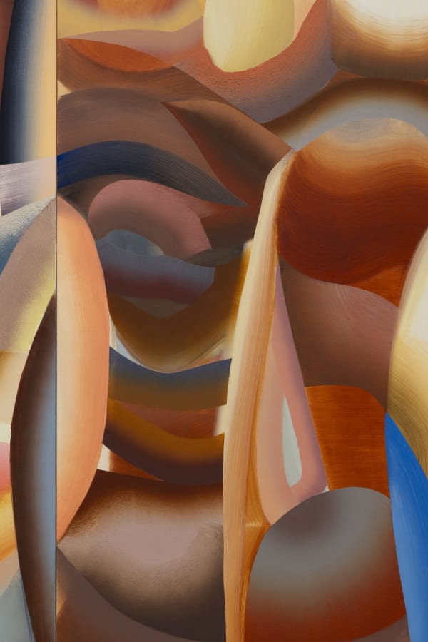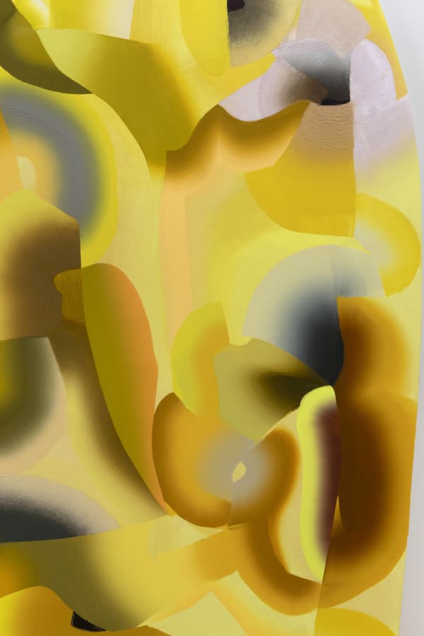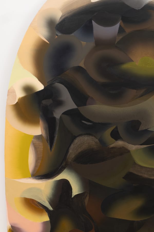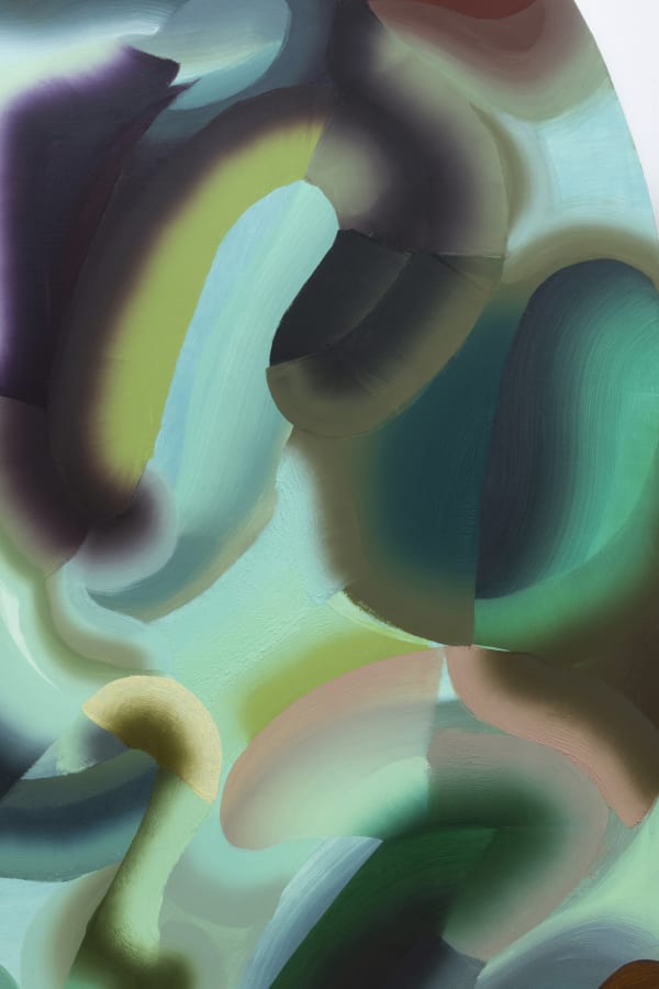 Debuting a new body of work, dual arched panels usher a novel shape within Hallberg’s practice, a departure from her previoustondos, which merged circular form with concentric action akin to the focusing of a microscopic or telescopic lens. Here, optical experience is still at the forefront, yet the tools for observation have shifted to a more analog frame - the binocular vision of two hands cupping one’s field of vision. Left and right exist separately as double takes or are stitched together into an unexpected, unified whole. Amplifying to anthropomorphic proportions, Hallberg’s works assert a corporality that not only prescribes a gestural mark making that enlists the entire body, but also extends that gesture by inviting an immersive, nearly synesthetic viewing experience, going beyond the purely visual.