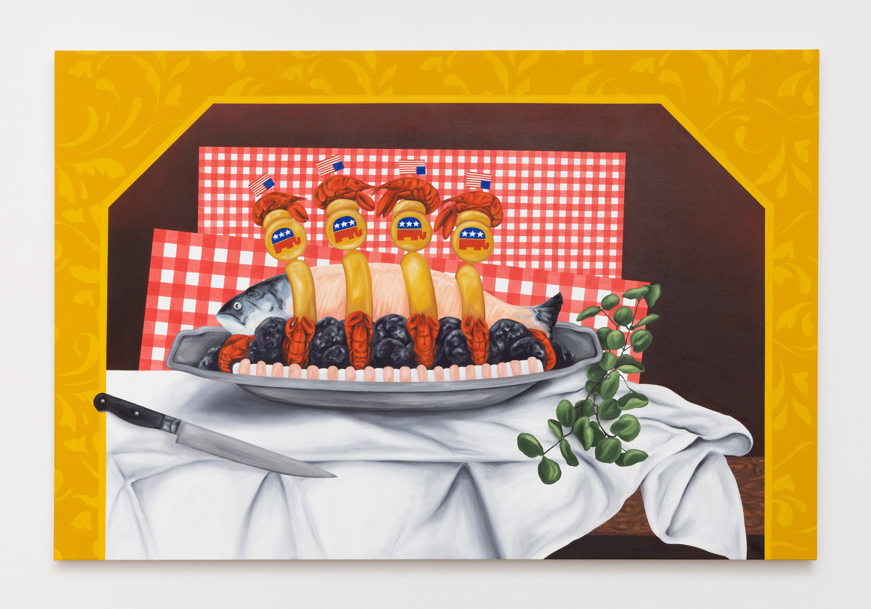 In this painting, a lavish display of seafood and caviar sit on a table top in the upper register of the composition. The table winds down to the very bottom of the canvas, diminishing in scale, and ending with a modest checkered tablecloth and two chairs - a nod to the impracticality and inaccessibility of such luxuries to the average working class American. In this painting, a lavish display of seafood and caviar sit on a table top in the upper register of the composition. The table winds down to the very bottom of the canvas, diminishing in scale, and ending with a modest checkered tablecloth and two chairs - a nod to the impracticality and inaccessibility of such luxuries to the average working class American.